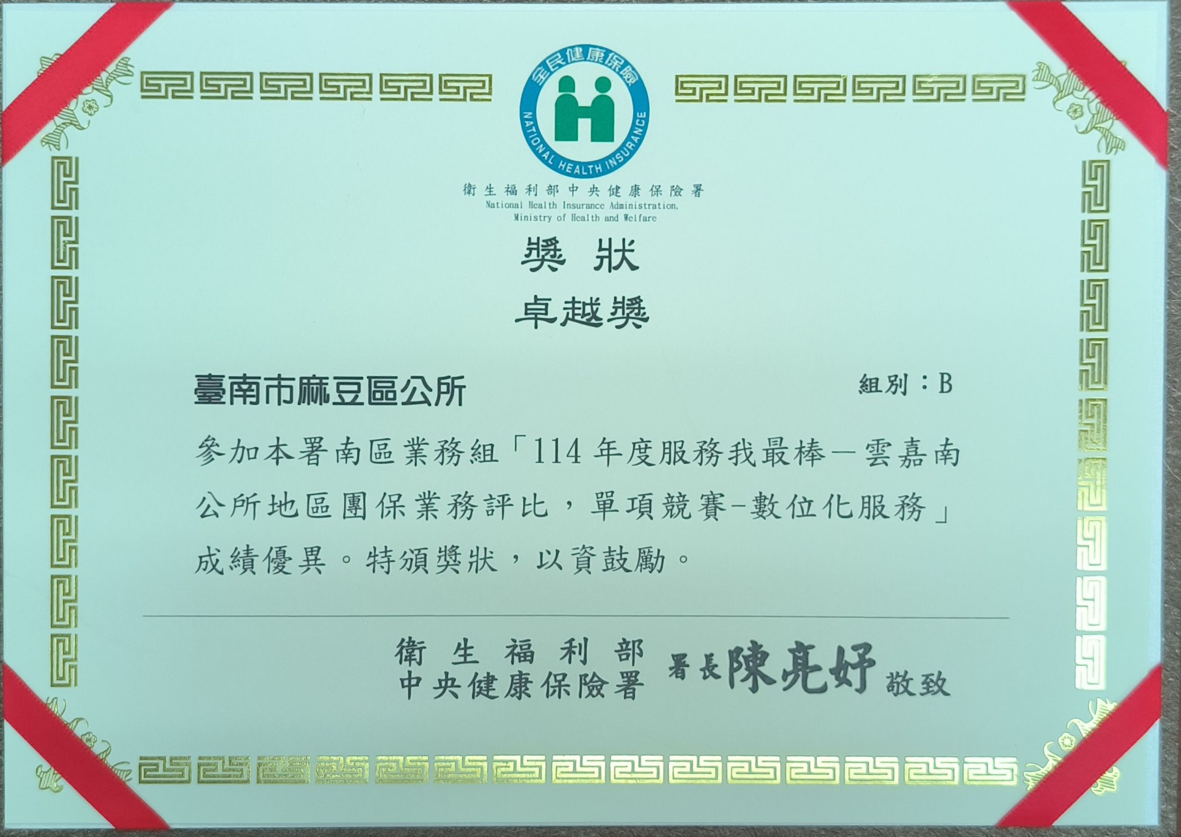 本所參加衛生福利部中央健康保險署南區業務組辦理「114年度服務我最棒-雲嘉南公所地區團保業務評比」,榮獲「單項競賽-數位化服務」成績優異。團隊長期致力於提升行政效能,推廣健保數位化申辦流程,以提供更便捷的健保加退保及各項團保諮詢。未來將秉持服務熱誠,持續深耕在地服務,精進數位治理。