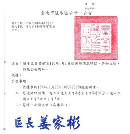 鹽水區圖書館110年1月1日起調整開放時間