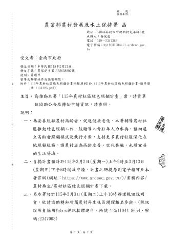 農業部農村發展及水土保持署推動為妥善照顧農村高齡者,促進健康老化並鼓勵導入青壯年人力,期未來結合在地產業形成地區性綠色照顧產業鏈 ,以綠場域、綠飲食、綠療育及綠陪伴四面向為主軸,推動農村社區綠色照顧工作,歡迎社區踴躍提案申請。