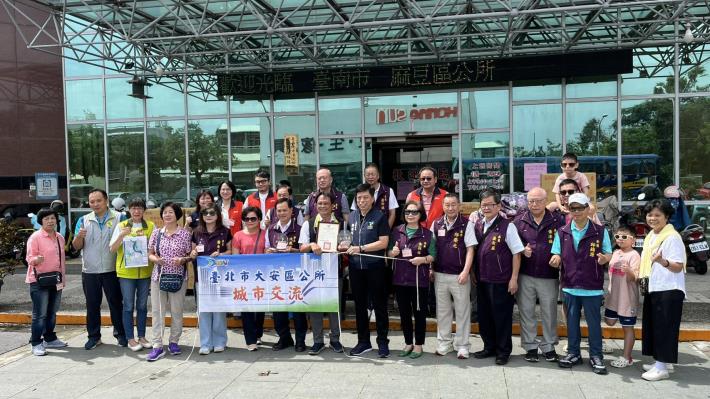 臺北市大安區公所暨大安區民俗委員會於7月10日至11日赴臺南市玉井區、麻豆區及鹽水區進行城市交流聯訪。今日由大安區區長鄭裕峯與民俗委員會會長沈鳳雲率領區公所幹部及委員一行共39人,並攜帶白米80包、衛生紙26箱、排骨雞麵20箱等多項民生物資,關懷本區低收入戶、獨居長者及弱勢邊緣戶。