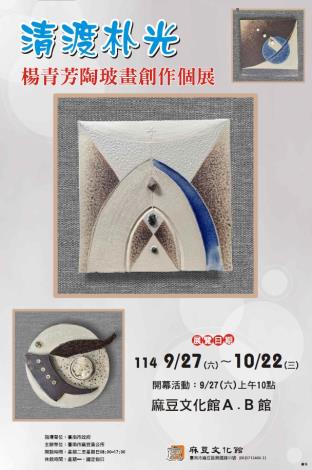 【展覽主題】:清渡朴光-楊青芳陶玻畫創作個展【展覽期間】:114年9月27日至114年10月22日【展覽地點】:麻豆文化館AB館 (臺南市麻豆區興國路11號1樓)【開放時間】:星期二至日08:00~17:00【休館時間】:星期一、國定假日、民俗節日當日休館【聯絡電話】:(06)5729007