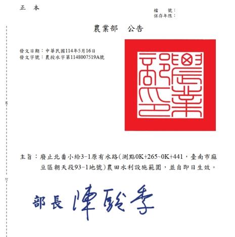 臺南市麻豆區朝天段93-1地號農田水利設施範圍廢止公告