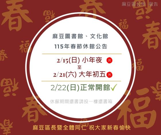 各位讀者朋友們請注意!春節連假即將到來,麻豆區圖書館及文化館的開館時間將有所調整,請大家留意開館時間,別白跑一趟囉!春節休館時間休館日期: 2月15日(日)小年夜 至 2月21日(六)大年初五恢復開館: 2月22日(日)起正常開館休館期間還書提醒如果您在休館期間需要歸還書籍,歡迎多加利用: 1樓還書箱(請直接將書投入即可)溫馨小提醒: 連假期間是閱讀的好時機,歡迎大家在休館前到館借好、借滿,讓書香陪您過好年!祝大家 馬年行大運,闔家平安!